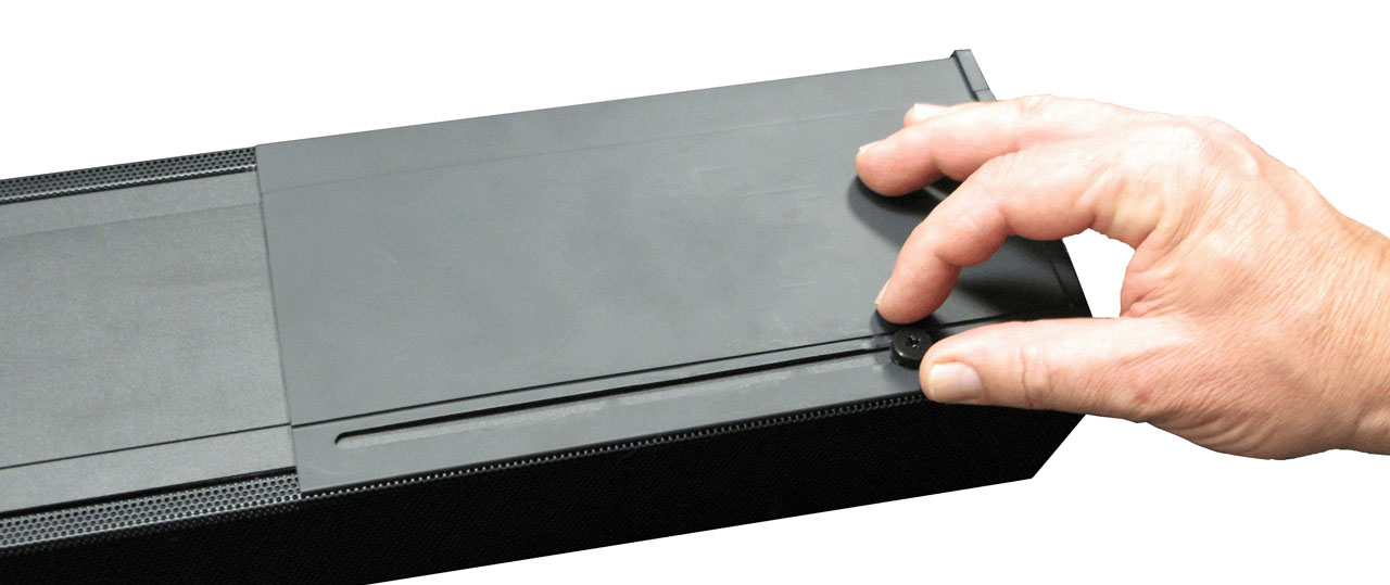 Coperto Solution Corporation Soundbars feature sliding end grilles that are adjusted without the use of any tools. Simply loosen the thumbscrew on the back and slide the grille out to perfectly match the width of the display. It couldn’t be easier.