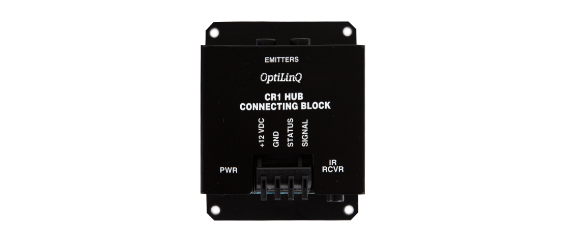 Coperto Solution Corporation IR Connecting blocks are the connection point between the IR Receiver, IR Emitters and the +12vdc power supplies. Connections include input terminals for voltage, signal and ground wires, input jack for IR receivers’ pre-terminated with a stereo mini plug and emitter output jacks for single or dual emitters.